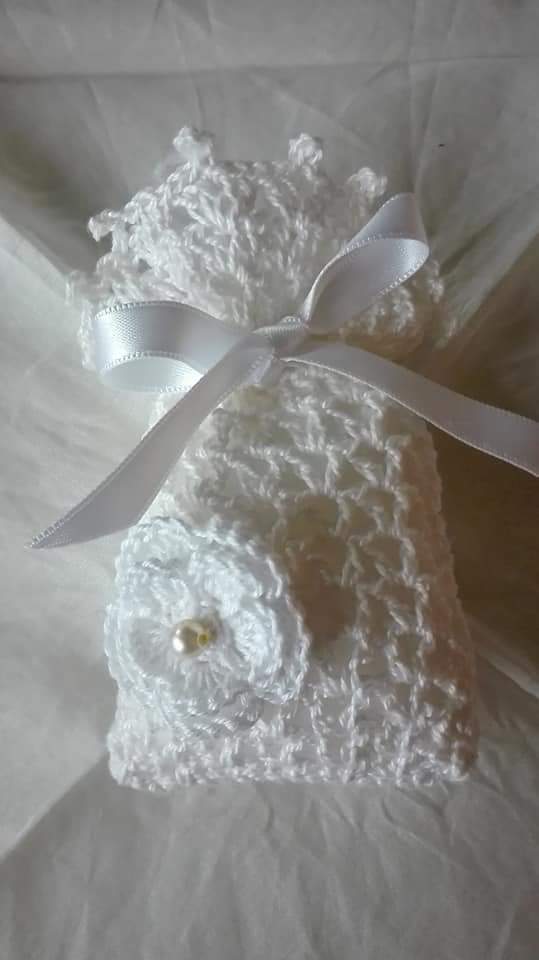 Bomboniere in cotone per battesimo o matrimonio, con fiocco in raso . I colori e le forme sono a scelta.