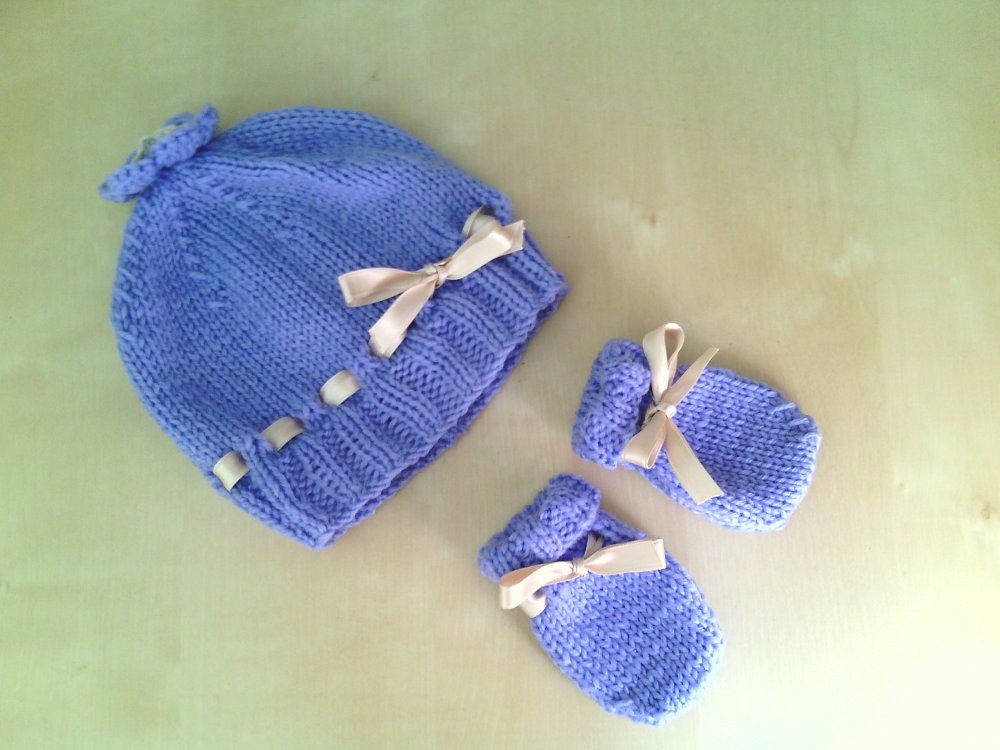 Completo elegante per neonata in tonalità lillà intenso(purtroppo la luce delle foto lo fanno apparire azzurro)composto da berretta con decorazione di fiore a crochet bicolore che richiama il nastrino in raso avorio legato con fiocchetto.I guantini riprendono il motivo con nastrino e fiocchetto.
