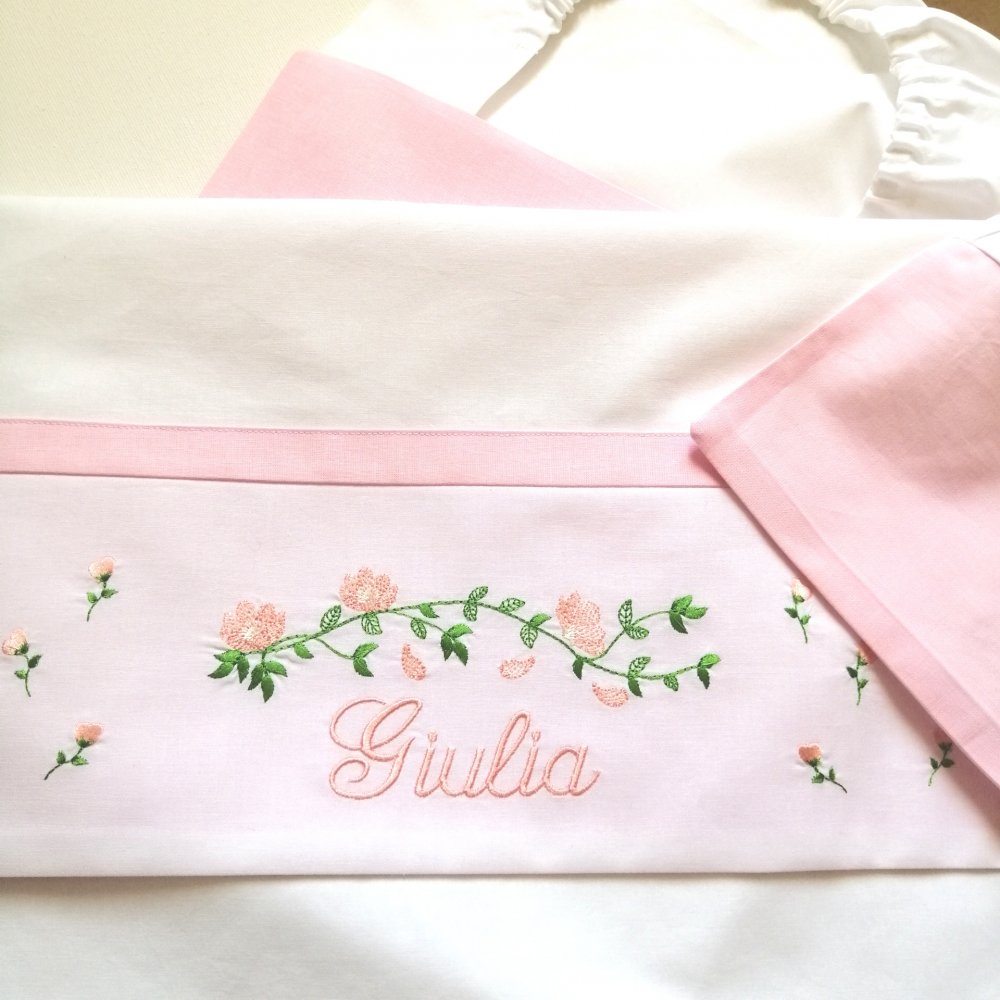 Coordinato per la carrozzina è composto di un lenzuolino sotto con l'elastico, una federa ed un lenzuolo personalizzato con un ricamo e un nome. I tessuti sono certificati. Per altre info e la disponibilità scrivetemi. Ricami a scelta.