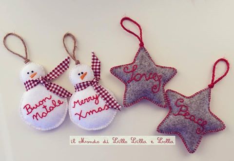 Naturalmente handmade! Le mie decorazioni per albero di Natale raffigurano romanticissime stelle alte circa 10 cm e arricchite con scritte ricamate in perfetto stile natalizio o simpatici pupazzi di neve con scritte ricamate e sciarpa natalizia. La confezione comprende 1 soggetto a scelta fra i due proposti che possono essere personalizzati nei colori e nelle decorazioni previo contatto. Per qualsiasi informazioni non esistate a contattarmi, sarò felice di rispondervi.