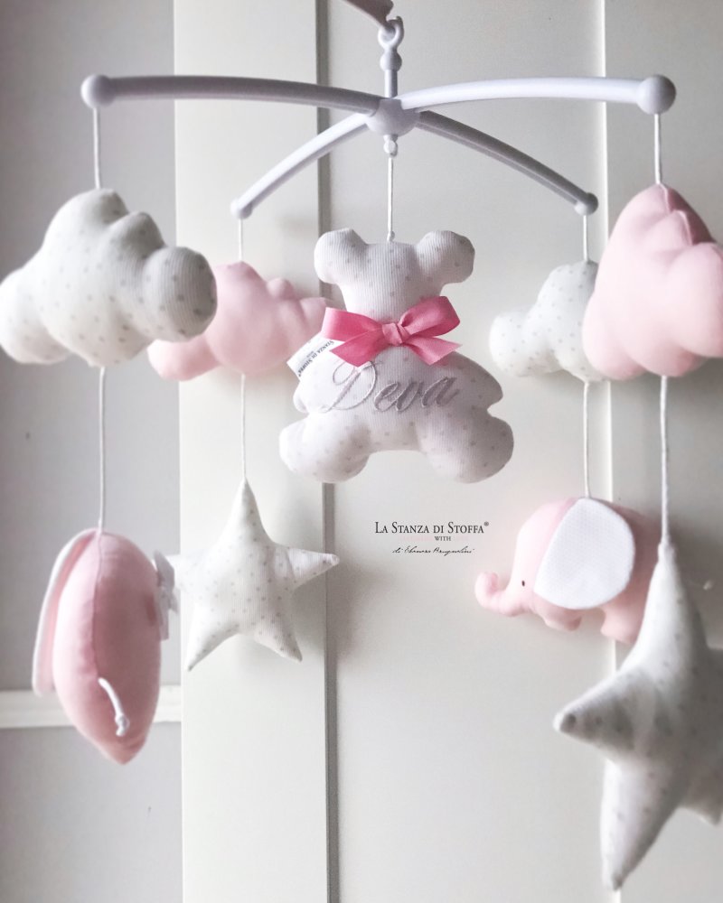 Bellissima giostrina da culla per accompagnare la nanna della tua bambina, insieme ad un tenero orsetto che vola tra le nuvolette, stelline e lune. Il meccanismo è compreso nel prezzo (se non si vuole il meccanismo, contattarmi per modificare il prezzo). La giostrina ha melodia ninna nanna Brahms e il meccanismo gira. Presenta 1 orsetto con nuvolette, lune e stelline. È pesonalizzabile nei colori e nei soggetti (se possibile).