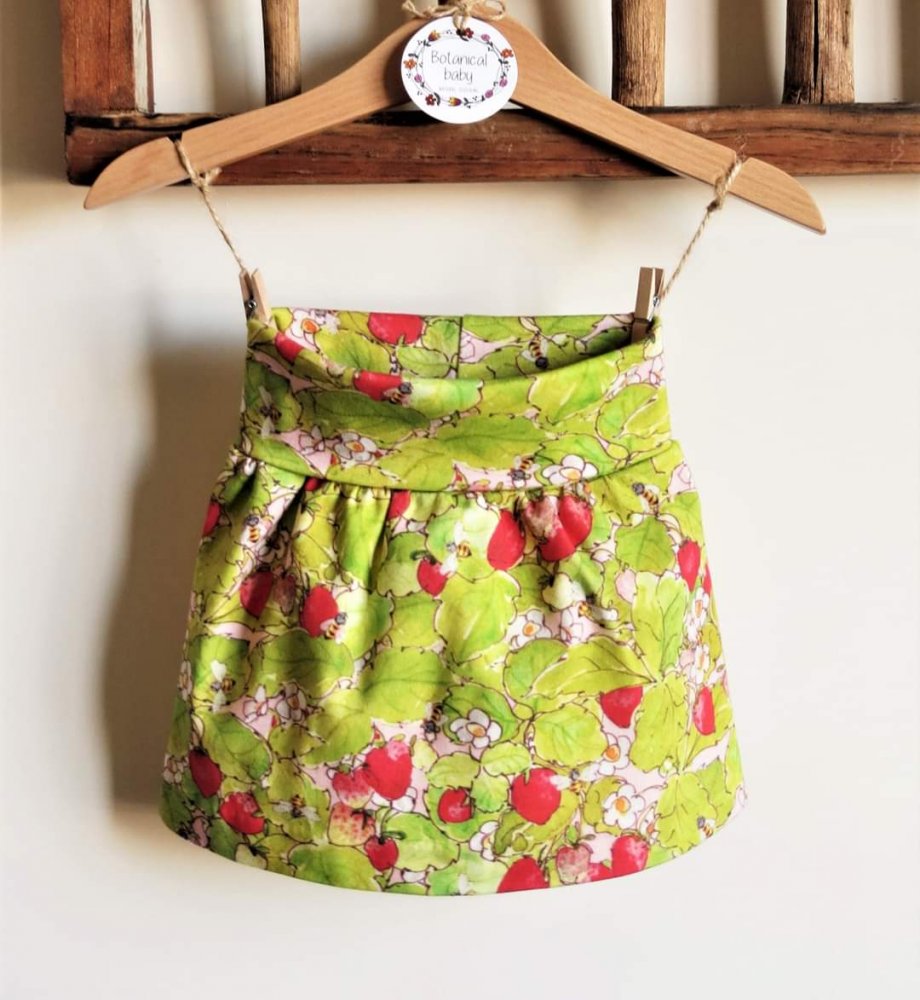 Gonnellina in morbida maglina di cotone biologico. Originale nella sua fantasia con fragoline, api e fiorellini bianchi. E' disponibile nella taglia 3/6 mesi. Lavare a freddo con detersivi privi di fosfati.