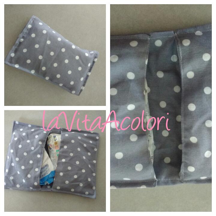 Una pratica pochette in cotone dalle dimensioni di 17x24 cm circa chiusa, corredata di due tasche dove riporre il necessario per il cambio del nostro piccolo. Pratica è veloce da chiudere anche con una mano sola grazie a un bottone a pressione in plastica in tinta o a contrasto con la pochette.
