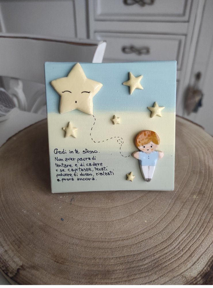Idea bomboniera, quadretti 10*10 in tela disegnati e dipinti a mano con soggetti in argilla modellata a mano, in elegante scatolina realizzata su misura. È possibile personalizzare la frase.