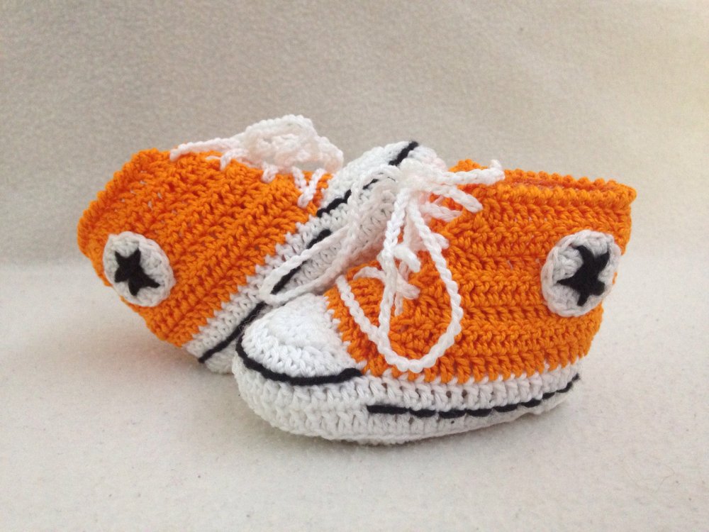Scarpine stile converse per neonato, realizzate a mano con uncinetto in puro cotone italiano arancione e bianco.