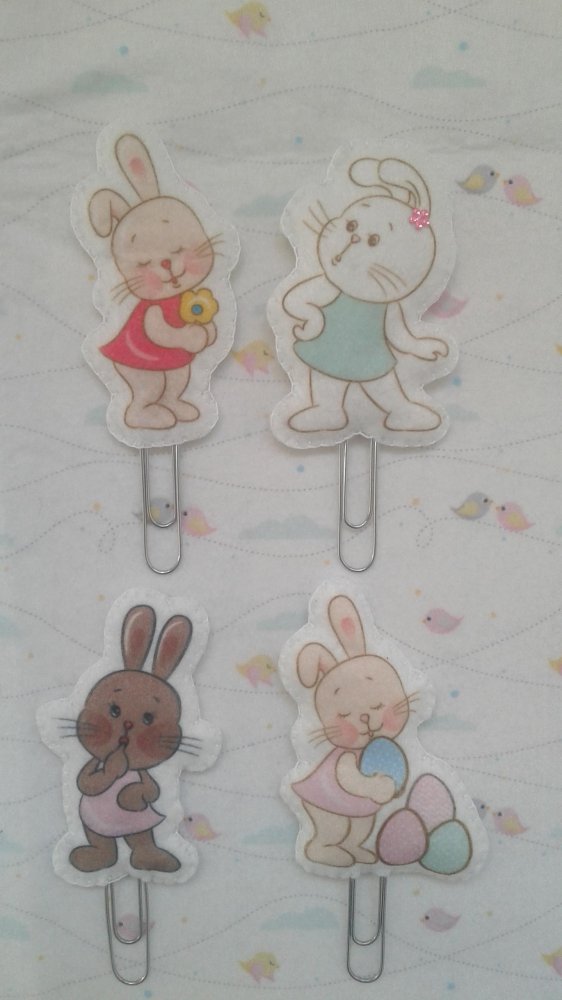 Set di quattro segnalibri coniglietti con graffetta alti 12,5 cm.