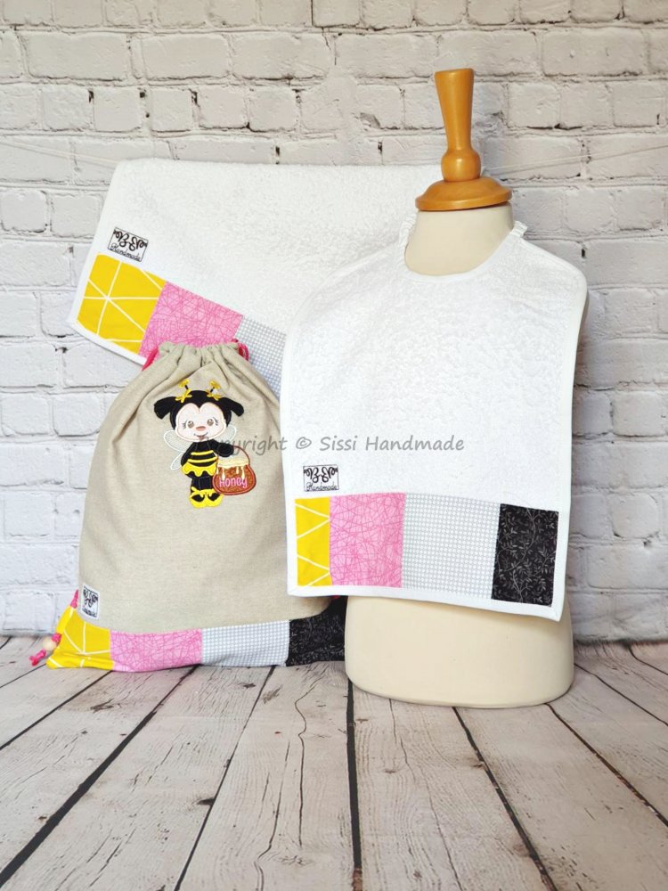 Sacca dal colore neutro con ape in appliqué, completa di laccio per la chiusura, completamente fatta a mano. Bavaglio ed asciugamano in spugna bianca con applicazione di inserti in tessuto per coordinare il tutto.