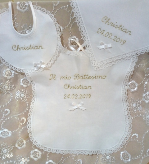 Delicatissimo set Battesimo per coronare un giorno importante composto da vestina ricamata a mano "Il mio Battesimo"(con cotone Mouline'), asciugamanina e bavaglino. Realizzato con finissimo cotone batista e impreziosito con del merletto tombolo di cotone e dei fiocchettini in raso. Unisex. Il set si caratterizza (rispetto a quello semplice) per il modello del bavaglio oltre che per la presenza di ricami sia sulla vestina che su bavaglio e fazzoletto. E' possibile scegliere il colore del ricamo (bianco, oro, argento, celeste o rosa) e il tipo di merletto. In fase di ordine è possibile definire il colore del ricamo, il tipo di merletto e cosa ricamare sui tre pezzi.