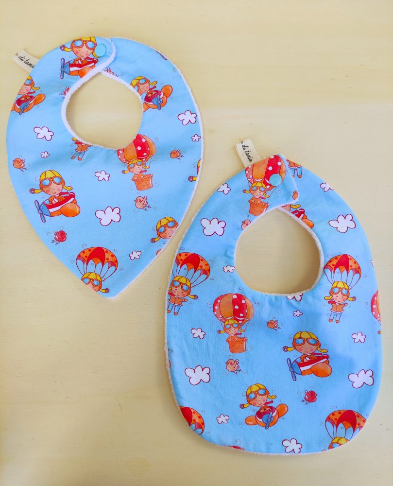 Set di due bavaglini realizzati in tessuto di cotone 100% e spugna . La fantasia del tessuto cosi dolci ma anche spiritose rallegreranno le prime pappe e le merende delle piccoline. Forma e spugna li rendono perfetti per lo svezzamento e le prime pappe e merende. il set cosi composto è un regalo completo per una piccolina nata da poco