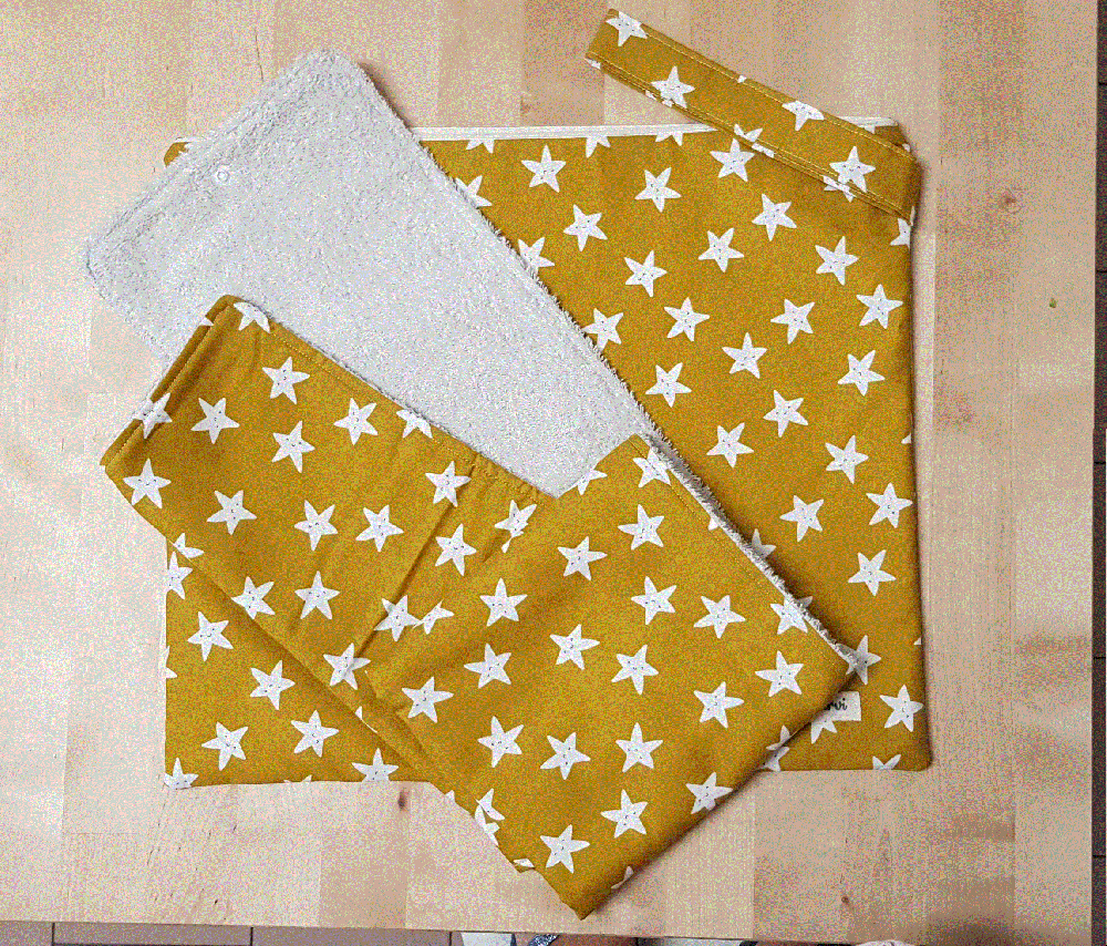Il set è composto da una pratica pochette con cerniera disponibile in 2 misure 30x25 cm circa oppure più grande 65x35 cm che può contenere un pratico fasciatoio di spugna e cotone a fantasia misure 66x37cm. Il prezzo è inteso per pochette ed asciugamano si possono poi aggiungere i doudou.